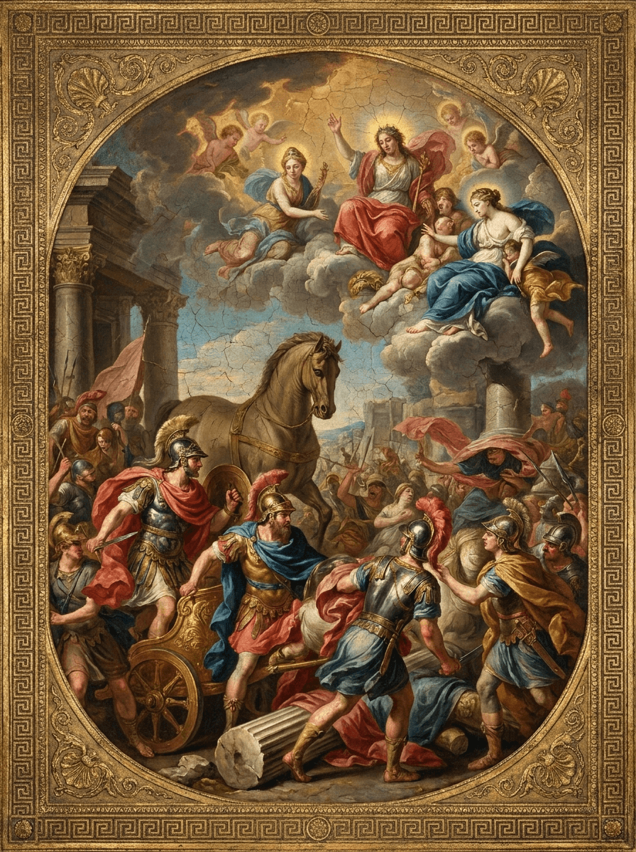 Priam was killed at the altar; Astyanax was thrown from the walls; Cassandra was violated at Athena’s shrine; Andromache, Hecuba, and the royal women became captives. Troy, unconquered for ten years, fell not by open force but by deception disguised as victory.